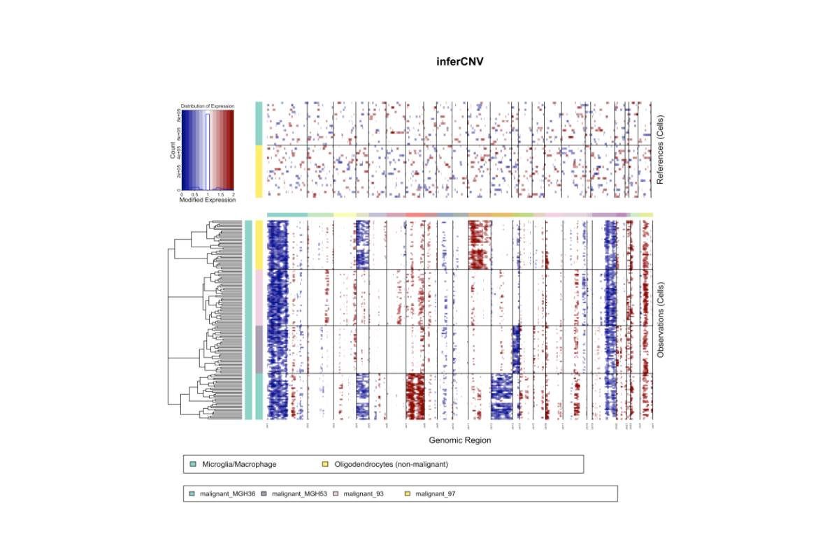 2014年發(fā)表在science(IF=47.728)上的《Single-cell RNA-seq highlights intratumoral heterogeneity in primary glioblastoma》[1],通過對(duì)基因相對(duì)表達(dá)水平來推斷每個(gè)細(xì)胞的大規(guī)??截悢?shù)變異(CNV)。該研究選擇正常人的腦組織bulk RNA-seq的數(shù)據(jù)作為對(duì)照,單細(xì)胞樣本聚為7組,無(wú)監(jiān)督分析確定了9個(gè)異常細(xì)胞,它們具有成熟少突膠質(zhì)細(xì)胞基因表達(dá)增加和膠質(zhì)母細(xì)胞瘤基因下調(diào)的特點(diǎn),剩余的420個(gè)細(xì)胞中沒有一個(gè)顯示出與非惡性細(xì)胞或免疫細(xì)胞類型的轉(zhuǎn)錄程序相似的特征。雖然非惡性細(xì)胞是腫瘤微環(huán)境的關(guān)鍵組成部分,但該研究通過解離和CD45+分選后,已經(jīng)很大程度上排除了非腫瘤細(xì)胞。該研究通過infer CNV有效地將腦膠質(zhì)母細(xì)胞瘤中的正常細(xì)胞與惡性細(xì)胞區(qū)分開來。