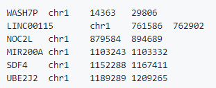(3) 基因或染色體位置文件:提供每個(gè)基因的染色體位置。文件共4列,分別是基因名稱、染色體和基因跨度,文件以制表符分隔。