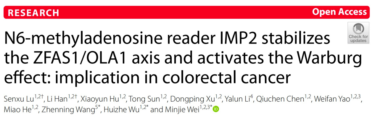 中文名稱:N6-甲基腺苷(m6A)閱讀蛋白IMP2能穩(wěn)定ZFAS1/OLA1軸并激活沃伯格效應(yīng):在結(jié)直腸癌中的意義