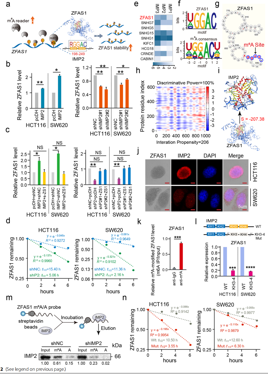 2、CRC細(xì)胞中IMP2通過(guò)直接與ZFAS1的m6A位點(diǎn)結(jié)合促進(jìn)ZFAS1的穩(wěn)定性