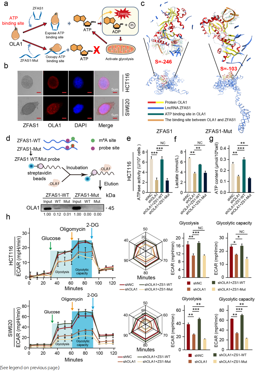 接下來(lái)探索OLA1的ATP酶活性的變化對(duì)CRC細(xì)胞能量代謝的影響,研究了HCT116和SW620細(xì)胞系中乳酸和ATP的含量。發(fā)現(xiàn)OLA1表達(dá)的減少不僅可以降低乳酸的積累,還可以減少細(xì)胞中ATP的含量(圖5f,g)。通過(guò)細(xì)胞外酸化率的測(cè)定檢測(cè)OLA1的變化對(duì)CRC細(xì)胞的糖酵解代謝能力的影響,發(fā)現(xiàn)OLA1表達(dá)的減少可以顯著降低CRC細(xì)胞的糖酵解代謝能力,ZFAS1-WT可以恢復(fù)OLA1表達(dá)減少對(duì)CRC細(xì)胞糖酵解代謝能力的影響(圖5h)。