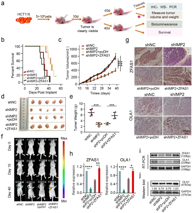 利用異體移植模型驗(yàn)證IMP2-ZFAS1-OLA1信號(hào)軸在體內(nèi)的生物學(xué)功能(圖7a),預(yù)后評(píng)估顯示異種移植小鼠在與shIMP2和ZFAS1載體共同轉(zhuǎn)染后,生存時(shí)間明顯縮短(圖7b),表明IMP2和ZFAS1在CRC預(yù)后評(píng)估中具有協(xié)同作用。此外,轉(zhuǎn)染shIMP2載體的異種移植小鼠中,腫瘤體積、大小和重量都明顯減少;然而,在與shIMP2和ZFAS1載體共同轉(zhuǎn)染后,腫瘤體積、大小和重量急劇增加(圖7c-e)。實(shí)驗(yàn)結(jié)果說(shuō)明在異種移植模型中,ZFAS1的過(guò)表達(dá)明顯地逆轉(zhuǎn)了IMP2沉默對(duì)腫瘤生長(zhǎng)的抑制作用(圖7f)。