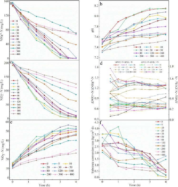 圖3 加入磷酸鹽MAB脫氮性能:(a) NH4+-N 濃度;(b) 酸堿度;(c) NO2–N濃度;(d)化學(xué)計(jì)量比;(e) NO3–N濃度;(f)底物轉(zhuǎn)化率