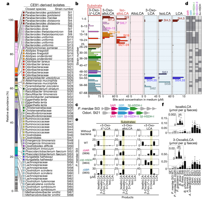 長(zhǎng)期以來(lái),微生物組一直被認(rèn)為是決定老年人健康狀況的關(guān)鍵因素,因?yàn)樗诳刂葡δ?、骨密度、神?jīng)活動(dòng)、免疫力和對(duì)病原體感染的抵抗力方面發(fā)揮著作用。百歲老人對(duì)衰老相關(guān)疾病、慢性炎癥和傳染病的易感性降低。在該研究中,發(fā)現(xiàn)百歲老人有一個(gè)獨(dú)特的腸道微生物組,其中富含能夠產(chǎn)生獨(dú)特的次級(jí)膽汁酸的微生物,包括各種異構(gòu)體的石膽酸(LCA):3-oxo-,allo-,3-oxoallo-和isoallolithocholic acid。在這些膽汁酸中,isoalloLCA的生物合成途徑從未被報(bào)導(dǎo)過(guò)。從一名百歲老人糞便微生物群中篩選出了68株細(xì)菌,在體外和體內(nèi)都鑒定了Odoribacteraceae菌株是產(chǎn)生同種isoalloLCA的有效菌株。此外,還發(fā)現(xiàn)5-羥基類固醇脫氫酶(3-α-β-HSDH)和5-羥基類固醇脫氫酶(5-β-reductase,5AR)負(fù)責(zé)isoalloLCA的產(chǎn)生。IsoalloLCA對(duì)革蘭氏陽(yáng)性多重耐藥病原菌,包括艱難梭狀芽胞桿菌和屎腸球菌有很強(qiáng)的抗菌活性。這些發(fā)現(xiàn)表明,特定膽汁酸的代謝可能與降低感染病原體的風(fēng)險(xiǎn)有關(guān),從而可能有助于維持腸道內(nèi)環(huán)境的穩(wěn)定。