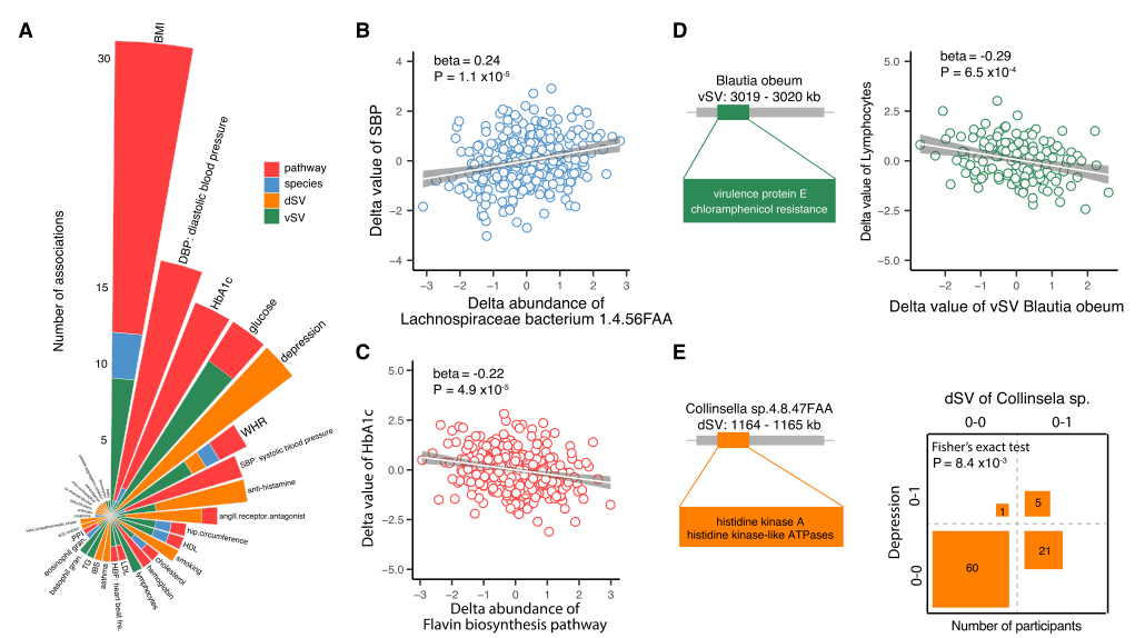 人的腸道中有各種各樣的微生物群落,這些微生物在個(gè)體間表現(xiàn)出很大的變異。該研究通過(guò)對(duì)腸道微生物群、51個(gè)人類表型和338個(gè)個(gè)體的1183個(gè)代謝物的血漿水平進(jìn)行4年的跟蹤調(diào)查,描述了微生物的穩(wěn)定性和變異與宿主生理的關(guān)系。利用這些個(gè)體特異性和時(shí)間穩(wěn)定的微生物圖譜,包括細(xì)菌SNPs和結(jié)構(gòu)變異,開(kāi)發(fā)了一種微生物指紋圖譜方法,在對(duì)相隔4年的宏基因組樣本進(jìn)行分類時(shí),準(zhǔn)確率高達(dá)85%。將該指紋方法應(yīng)用到獨(dú)立的HMP隊(duì)列中,對(duì)于相隔1年的樣本,準(zhǔn)確率為95%。進(jìn)一步觀察了多種細(xì)菌種類的豐度、代謝途徑、結(jié)構(gòu)變異以及菌株替換的時(shí)間變化。報(bào)告了190個(gè)縱向微生物與宿主表型相關(guān),519個(gè)與血漿代謝物相關(guān)。這些關(guān)聯(lián)包含心臟代謝特征、維生素B和尿毒癥毒素。最后,中介效應(yīng)分析表明腸道微生物群可能通過(guò)其代謝產(chǎn)物影響心臟代謝健康。