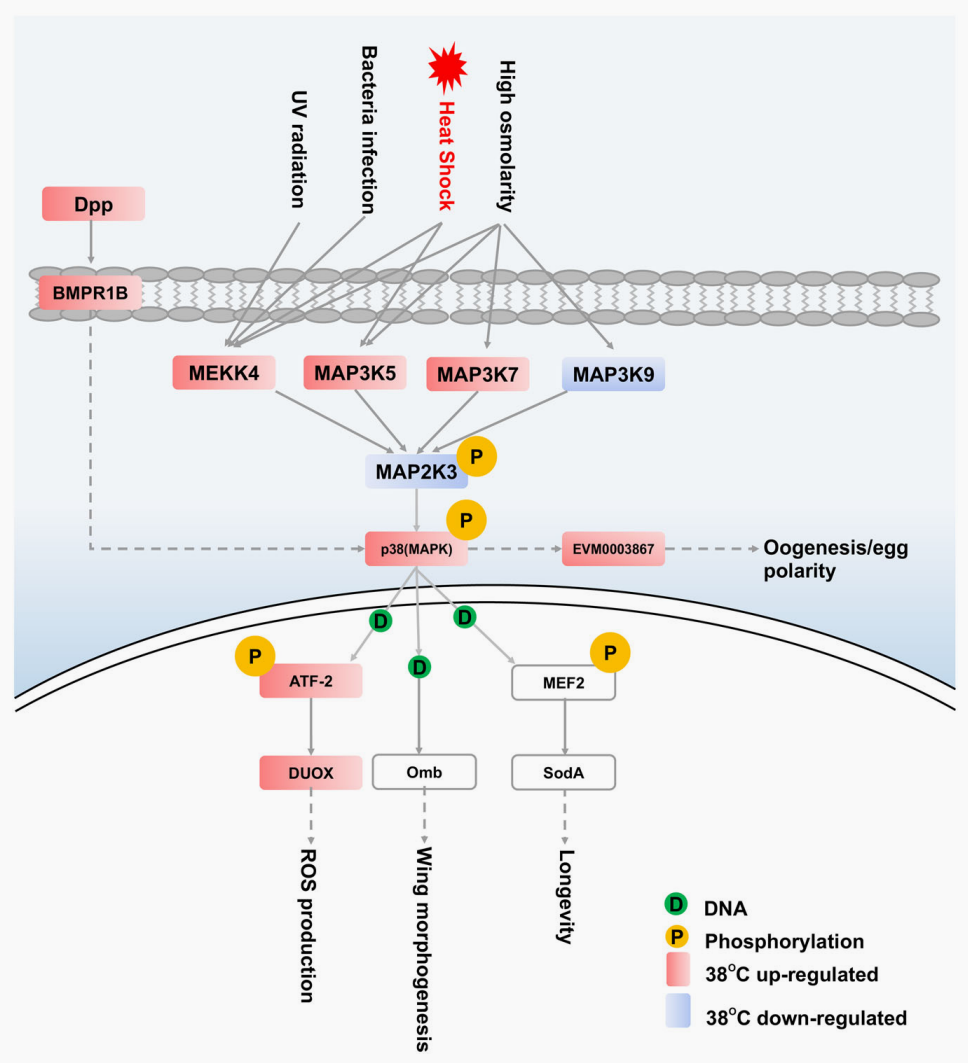 作者進(jìn)一步結(jié)合不同逆境條件處理下的轉(zhuǎn)錄組數(shù)據(jù),分析推測(cè)出橘小實(shí)蠅中熱休克蛋白的相對(duì)穩(wěn)定高表達(dá)是其快速適應(yīng)逆境的內(nèi)在機(jī)制。并發(fā)現(xiàn)在高溫條件下,p38 MAPK通路關(guān)鍵基因表現(xiàn)為應(yīng)激性高表達(dá),表明p38MAPK信號(hào)通路在橘小實(shí)蠅快速適應(yīng)新環(huán)境的過(guò)程中發(fā)揮重要作用,并且可能是橘小實(shí)蠅在非生物脅迫下維持穩(wěn)態(tài)機(jī)制的核心。