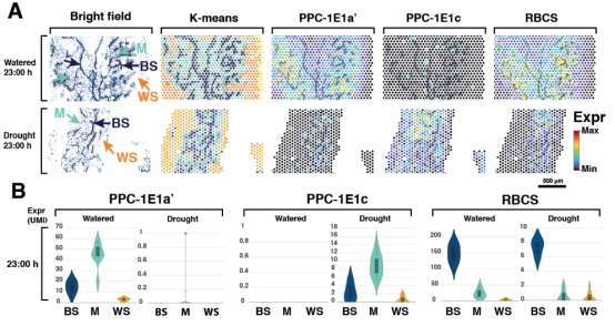 1. 研究人員通過激光顯微技術對不同環(huán)境(水分充足及干旱環(huán)境,白天及夜間)葉片進行切割區(qū)分,獲得葉肉,葉鞘及水分貯藏細胞,進行傳統(tǒng)的轉(zhuǎn)錄組分析,并結(jié)合空間轉(zhuǎn)錄組測序及葉片的組織區(qū)分,分析了C4及CAM相關的差異表達基因,并建立了流量平衡模型,預測了干旱條件下c4 +CAM系統(tǒng)的完整性。