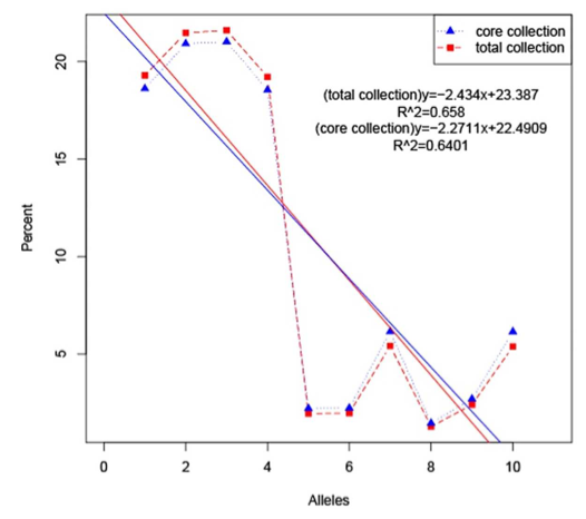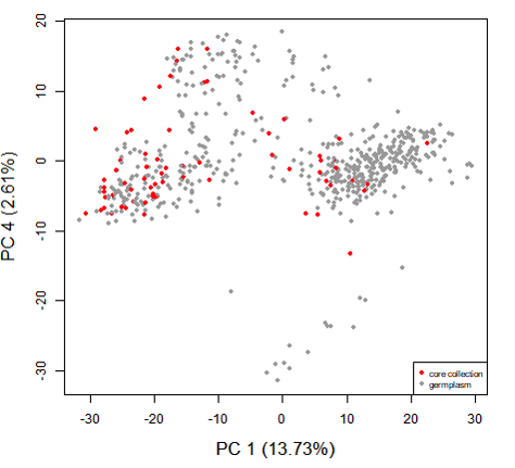 核心種質(zhì)資源(core?collection),即保存的種質(zhì)資源的一個(gè)核心子集,是采用一定方法,從保存的某一物種種質(zhì)資源中抽取的一個(gè)核心子集,以最少的遺傳資源樣本量最大限度地代表包括地理分布在內(nèi)的整個(gè)資源群體的遺傳多樣性,而未列入核心種質(zhì)的其它資源材料則作為保留樣本予以保存。因此核心種質(zhì)可以作為種質(zhì)資源群體研究和利用的切入點(diǎn),從而提高整個(gè)種質(zhì)庫(kù)的管理和利用水平。