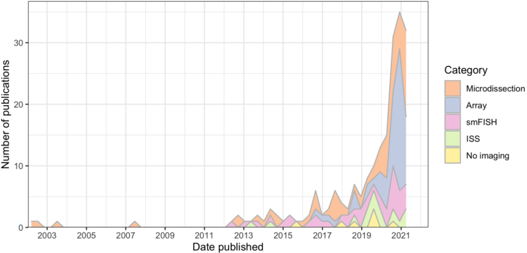 空間組學(xué)相關(guān)論文數(shù)量呈指數(shù)性爆炸增長 Nat Methods. 2022 Mar 10. doi: 10.1038/s41592-022-01409-2.