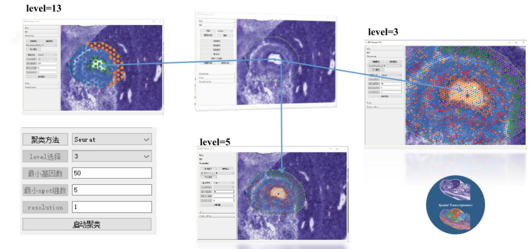 研發(fā)的百創(chuàng)S1000數(shù)據(jù)分析流程和工具軟件包:BSTMatrix可用于空間表達(dá)矩陣獲取兼容下游第三方軟件分析,亞細(xì)胞分辨率supspot level實(shí)現(xiàn)100μm~5μm多級(jí)分辨率數(shù)據(jù)挖掘分析,高效便捷在線可視化BSTViewer助你輕松獲取不同分辨率下可視化結(jié)果。