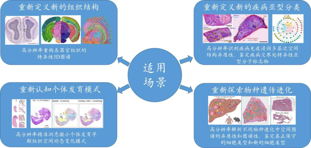 高分辨率價(jià)值在于可在微小組織、腫瘤組織、細(xì)胞類型亞型分析、識(shí)別未知細(xì)胞等方面發(fā)揮得天獨(dú)厚的優(yōu)勢(shì),百創(chuàng)S1000 亞細(xì)胞分辨率可以適用不同個(gè)體、組織、發(fā)育時(shí)期,適用現(xiàn)階段任何組織空間分析信息的獲取,正式開(kāi)啟間轉(zhuǎn)錄組測(cè)序亞細(xì)胞時(shí)代。