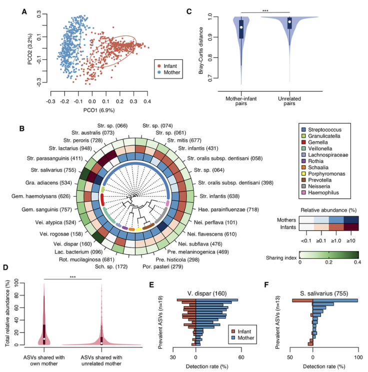 (A)?基于BrayCurtis距離的母親和嬰兒樣本的PCoA圖。(B)優(yōu)勢(shì)OTU的平均相對(duì)豐度和共享指數(shù)。(C)母嬰配對(duì)(n=448)和無(wú)關(guān)母嬰配對(duì)(n=198,464)的Bray-Curtis距離的小提琴曲線圖。(D)每名嬰兒與親生母親(n=448)和與無(wú)親緣關(guān)系的母親(n=198,464)分享的ASV總相對(duì)豐度的小提琴曲線圖。(E,F(xiàn))與Veillonella dispar和?Streptococcus salivarius相對(duì)應(yīng)的ASV的分布。