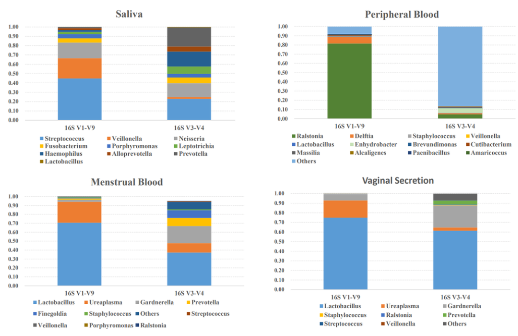 方法:采用二代16S rRNA基因V3-V4短讀長(zhǎng)測(cè)序和基于單分子實(shí)時(shí)測(cè)序的16S rRNA基因全長(zhǎng)測(cè)序,對(duì)唾液、外周血、陰道分泌物和月經(jīng)血中的微生物進(jìn)行分類。