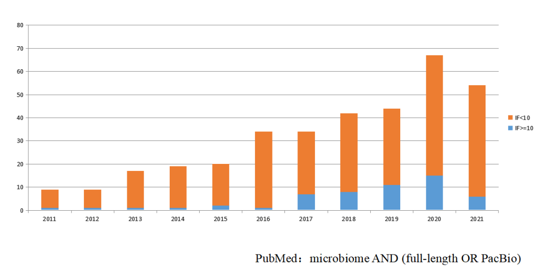 根據(jù)PubMed檢索結(jié)果,我們可以看到運(yùn)用全長(zhǎng)微生物多樣性發(fā)表的文章逐年遞增。一方面隨著測(cè)序技術(shù)也越來(lái)越成熟;另一方面PacBio sequel II通量的提升使得研究成本大幅降低,全球越來(lái)越多的研究學(xué)者開(kāi)始采用全長(zhǎng)微生物多樣性測(cè)序來(lái)進(jìn)行微生物組學(xué)研究。