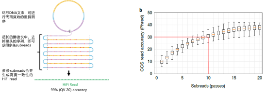 PB全長(zhǎng)多樣性測(cè)序基于HIFI模式對(duì)單一片段進(jìn)行多輪測(cè)序的方式來(lái)提升準(zhǔn)確性。由于PacBio的原始錯(cuò)誤為隨機(jī)錯(cuò)誤,可通過(guò)獲取CCS(Circular Consensus Sequencing)進(jìn)行自身糾正來(lái)提升數(shù)據(jù)的準(zhǔn)確性。