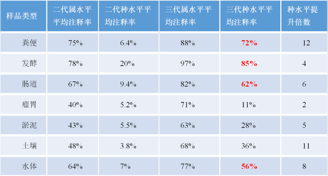 運(yùn)用三代測(cè)序,可以輕松跨越V1-V9區(qū),進(jìn)而獲得全長(zhǎng)序列,序列中攜帶的特征信息更多,可以支持“種”水平的分辨率,在文章撰寫(xiě)中可在種水平進(jìn)行深入挖掘和討論,尤其是在biomarker的尋找。常規(guī)樣本平均種水平注釋率可達(dá)60%。