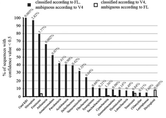 橫軸表示物種,縱軸表示豐度,黑色柱子表示全長(zhǎng)16S鑒定準(zhǔn)確而V4區(qū)測(cè)序失真;白色柱子表示V4區(qū)鑒定準(zhǔn)確而全長(zhǎng)16S結(jié)果失真,對(duì)比可以看出,全長(zhǎng)16S的覆蓋度和準(zhǔn)確度更高。E Singer et al.?ISME J
