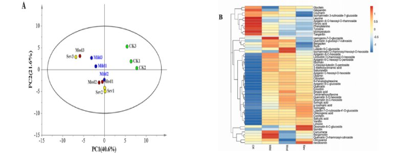 Fig 2 采用主成分分析法(A)和層次聚類分析法(B)對不同程度油斑病青檸檬的初級代謝產(chǎn)物進(jìn)行分析