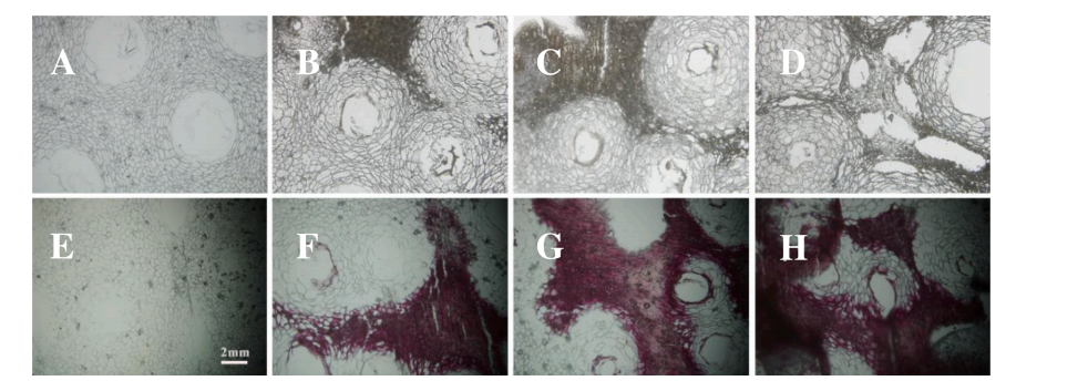 為了從形態(tài)學(xué)角度揭示油斑病對檸檬皮中木質(zhì)素積累的影響,采用間苯三酚-鹽酸反應(yīng)對健康和油斑病檸檬皮的橫截面進(jìn)行了木質(zhì)素化研究。在染色前,健康檸檬皮的細(xì)胞排列整齊,沒有塌陷,而輕度油斑病檸檬皮的細(xì)胞似乎塌陷并堆積在一起。隨著油斑病嚴(yán)重程度的增加,細(xì)胞的堆積越來越明顯,細(xì)胞間組織的塌陷導(dǎo)致不同程度的破裂,特別是在油斑病嚴(yán)重的檸檬皮中,可以觀察到許多裂痕洞(Fig. 4)。