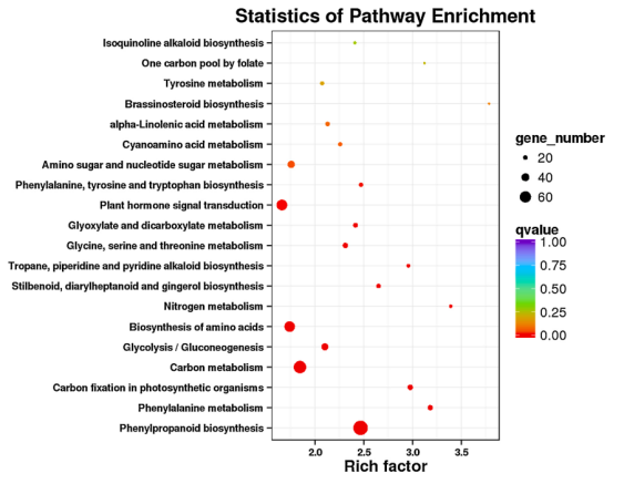 為了從分子水平研究油斑病損傷檸檬皮代謝產(chǎn)物的基因調(diào)控機(jī)制,對健康和嚴(yán)重油斑病檸檬皮進(jìn)行了轉(zhuǎn)錄組測序。在健康檸檬皮和油斑病損傷檸檬皮中共鑒定到2198個上調(diào)和1415個下調(diào)的DEGs。1810個DEGs被注釋到已知的代謝途徑,其中GO生物過程中與生長負(fù)調(diào)控、甲殼素分解代謝過程、氧化還原過程、肉桂酸生物合成過程、木質(zhì)素生物合成過程和碳水化合物代謝過程顯著富集。KEGG通路包括苯丙氨酸生物合成、苯丙氨酸代謝、糖代謝和糖酵解/糖異生、植物激素信號轉(zhuǎn)導(dǎo)和光合生物的碳固定豐顯著富集(Fig. 6)。
