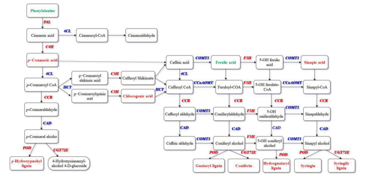 本研究采用多種生物學(xué)方法對青檸檬油斑病木質(zhì)素積累的機(jī)制進(jìn)行了分析。油斑病損傷檸檬皮的初級代謝物(尤其是葡萄糖)顯著降低,次級代謝物(尤其是木質(zhì)素)顯著增加。檸檬皮在油斑病下發(fā)生嚴(yán)重的木質(zhì)化,苯丙素的生物合成被顯著激活,與木質(zhì)素積累相關(guān)的DEGs有79個,其中65個基因顯著上調(diào),尤其是PAL、C4H、CCR、F5H POD和UGT72E基因。油斑病損害的檸檬皮具有較高水平的木質(zhì)素積累和增強(qiáng)對病原真菌的防御。該研究是首次報道檸檬油斑病對病原真菌表現(xiàn)出較高的抗性。
