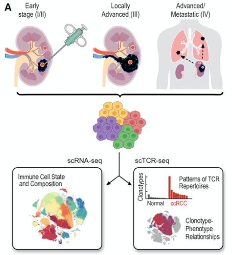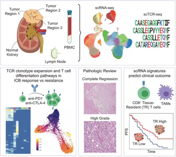 中文題目:?jiǎn)渭?xì)胞測(cè)序?qū)CRCC中多區(qū)域免疫圖譜和組織駐留T細(xì)胞與腫瘤拓?fù)浣Y(jié)構(gòu)和免疫治療效果聯(lián)系起來(lái)