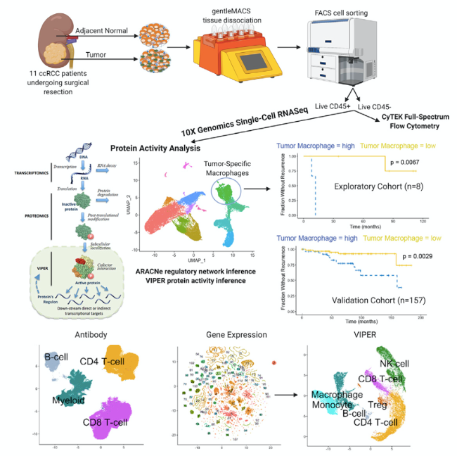 研究?jī)?nèi)容:腎透明細(xì)胞癌(CCRCC)是一種異質(zhì)性疾病術(shù)后病程可變。為了建立一個(gè)全面的CCRCC腫瘤免疫微環(huán)境(TME)圖譜,對(duì)未經(jīng)治療的CCRCC切除的腫瘤和腫瘤鄰近組織的造血和非造血亞群進(jìn)行scRNA-seq。利用VIPER算法進(jìn)行單細(xì)胞蛋白活性定量,并通過(guò)與流式細(xì)胞術(shù)的比較來(lái)驗(yàn)證該方法。該分析鑒定了關(guān)鍵的TME亞群以及它們主要的調(diào)控因子和候選細(xì)胞-細(xì)胞相互作用,揭示了基因表達(dá)分析無(wú)法檢測(cè)的臨床相關(guān)人群。本文發(fā)現(xiàn)一個(gè)特征為T(mén)REM2/APOE/C1Q上調(diào)的特異巨噬細(xì)胞亞群,并通過(guò)空間分辨、定量多光譜免疫熒光驗(yàn)證。在一個(gè)大型臨床驗(yàn)證隊(duì)列中,這些標(biāo)志物在術(shù)后復(fù)發(fā)患者的腫瘤中顯著富集。因此,該研究確定了TREM2/APOE/C1Q陽(yáng)性巨噬細(xì)胞浸潤(rùn)作為CCRCC復(fù)發(fā)的潛在預(yù)后生物標(biāo)志物以及一個(gè)候選治療靶點(diǎn)。
