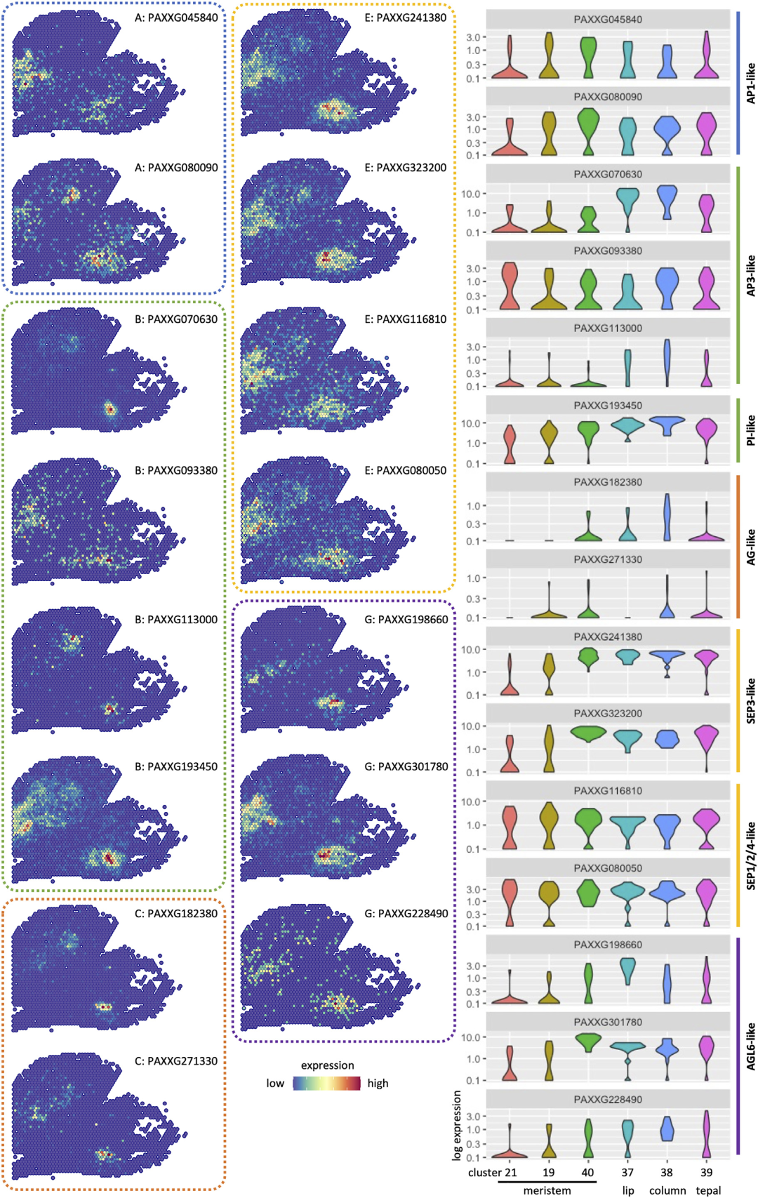 為了發(fā)現(xiàn)蘭花中特異的ABC code,本研究對(duì)7種被子植物的MADS-box基因進(jìn)行了系統(tǒng)發(fā)育分析。在蝴蝶蘭中的21個(gè)ABCDEG類(lèi)MADS-box基因中,有15個(gè)基因在空間轉(zhuǎn)錄組數(shù)據(jù)集上檢測(cè)到表達(dá)信號(hào),且在不同組織部位呈現(xiàn)出優(yōu)先或特異的表達(dá)模式(圖3)。其中,AP3-like和PI-like基因(B類(lèi)基因)均在花被片、唇瓣和花柱的原基中表達(dá)。特別是PAXXG070630在花柱頂端組織周?chē)憩F(xiàn)出梯度表達(dá)信號(hào),其中單個(gè)spot點(diǎn)表達(dá)量高,其周?chē)?xì)胞的表達(dá)信號(hào)隨著離中心spot點(diǎn)的距離增大而減弱,表明花藥在發(fā)育的這一階段是從單個(gè)spot點(diǎn)開(kāi)始的。AG-like(C類(lèi)基因)的空間表達(dá)譜上也存在類(lèi)似的情況,為花藥的器官發(fā)生提供了進(jìn)一步的證據(jù)。而AP1-like基因(A類(lèi)基因)優(yōu)先表達(dá)于分生組織中或廣泛表達(dá)于各器官中,AGL6-like(G類(lèi)基因)則在唇瓣和花被片中特異表達(dá)。
