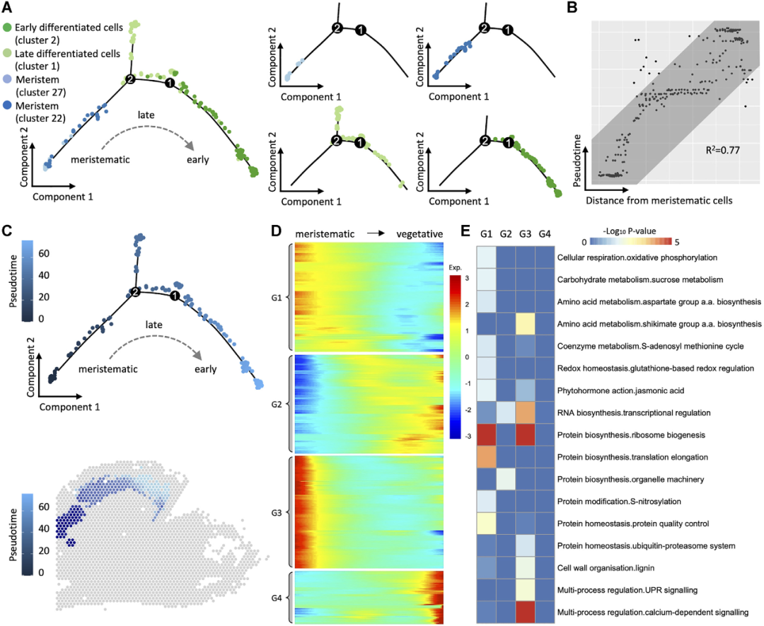 為了研究從分生組織細(xì)胞到營(yíng)養(yǎng)型細(xì)胞(花被、唇瓣)和生殖細(xì)胞(花柱)的分化,研究團(tuán)隊(duì)用Monocle繪制了細(xì)胞狀態(tài)的軌跡。如圖2B所示,三簇分生組織細(xì)胞形成了一條連續(xù)的路徑,代表其發(fā)育過(guò)程,與其在組織學(xué)切片上的位置高度一致。該路徑分為兩條子路徑:一條是由花被片中的營(yíng)養(yǎng)型細(xì)胞組成,另一條由花柱中的花藥原基生殖細(xì)胞組成。細(xì)胞類(lèi)型變化的軌跡作為動(dòng)態(tài)發(fā)育過(guò)程的靜態(tài)投影,也可以理解為分生組織細(xì)胞的擬時(shí)序分化。如圖2C所示,此時(shí)營(yíng)養(yǎng)型細(xì)胞出現(xiàn)較早,并分散在子路徑的遠(yuǎn)端。共鑒定出4,685個(gè)空間差異基因與發(fā)育擬時(shí)間相關(guān),對(duì)這些基因繪制分支軌跡基因表達(dá)熱圖,發(fā)現(xiàn)它們隨著發(fā)育路徑的分離表現(xiàn)出不同的表達(dá)模式(圖2D)。MapMan功能富集圖顯示它們主要富集在細(xì)胞壁代謝、激素、脂質(zhì)、蛋白質(zhì)和RNA合成等功能上(圖2E)。通過(guò)基因的擬時(shí)分布圖發(fā)現(xiàn)許多其他基因可能在分生組織、營(yíng)養(yǎng)組織和生殖組織的細(xì)胞分化過(guò)程中發(fā)揮作用(圖2F)。