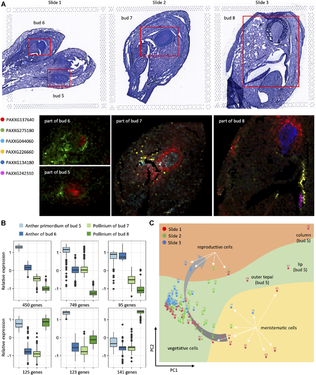 與花被、唇瓣這類(lèi)營(yíng)養(yǎng)組織不同,花藥的發(fā)育起始時(shí)間更晚,過(guò)程也更為復(fù)雜?;ㄋ幤鹗加诨ㄖ敹说幕ㄋ幵?,如圖2A所示,spot點(diǎn)中B-和C-功能基因表達(dá)呈現(xiàn)高表達(dá)。與此同時(shí),許多下游基因被激活,用于進(jìn)一步的形態(tài)建成過(guò)程。例如,在6號(hào)花苞的花藥中心出現(xiàn)花粉塊,之后在7號(hào)和8號(hào)花苞中可以觀察到它的形狀變化過(guò)程(圖5A)。為了進(jìn)一步探究花藥發(fā)育過(guò)程中基因表達(dá)的動(dòng)態(tài)變化,收集了花藥原基或花粉上優(yōu)先表達(dá)的1,683個(gè)基因進(jìn)行比較,發(fā)現(xiàn)不同花苞之間存在不同的表達(dá)模式。正如如圖5B所示,在5號(hào)花苞和8號(hào)花苞中分別有123和141個(gè)基因高表達(dá)。而其中大部分基因呈現(xiàn)從5號(hào)花苞到8號(hào)花苞整體減少的表達(dá)模式。展示了與蘭花生殖相關(guān)營(yíng)養(yǎng)型細(xì)胞中特異表達(dá)或優(yōu)先表達(dá)的一系列關(guān)鍵基因,顯示了花藥發(fā)育過(guò)程中表達(dá)譜的動(dòng)態(tài)變化。通過(guò)對(duì)三個(gè)樣本的120個(gè)clusters進(jìn)行PCA分析,表明花藥的早期營(yíng)養(yǎng)組織,雖然存在相似的基因表達(dá)模式,沒(méi)有表現(xiàn)出特異表達(dá)的基因,但在發(fā)育后期迅速經(jīng)歷了分化和形態(tài)建成過(guò)程(圖5C)。