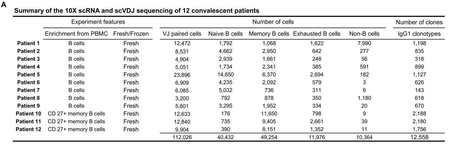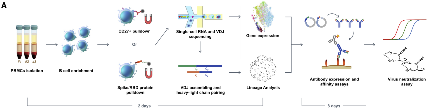 樣本設計:從12個COVID-19康復患者的外周血單核細胞PBMC中分離B細胞,對B細胞和CD27+記憶B細胞進行scRNA-seq + scBCR-seq,獲得IgG1亞型抗體,并進行抗體體外檢測和篩選。