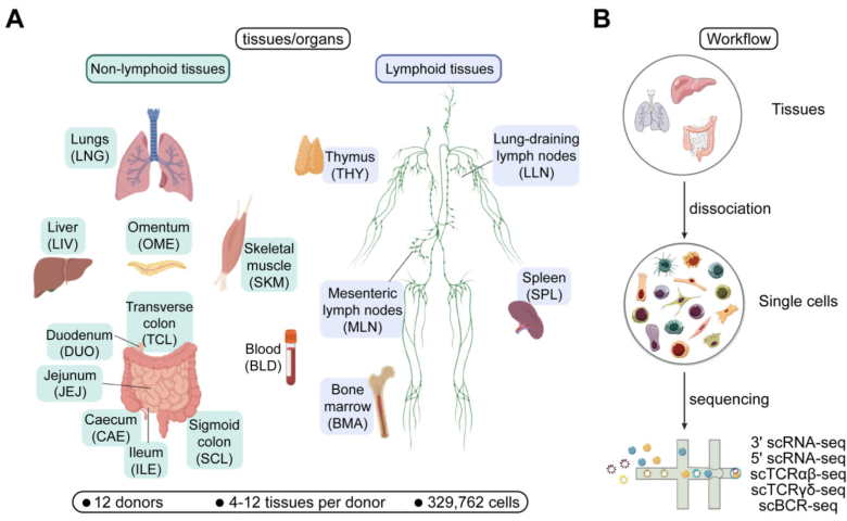 樣本設計:2個成人捐獻者的16份組織樣本,分別進行scRNA、scTCR、scBCR,實驗中采集的組織樣本包括初級淋巴器官(骨髓)和次級淋巴器官(脾、肺引流和腸系膜淋巴結)、粘膜組織(腸和肺)以及血液和肝臟等非淋巴組織,還包括胸腺、骨骼肌和網(wǎng)膜。