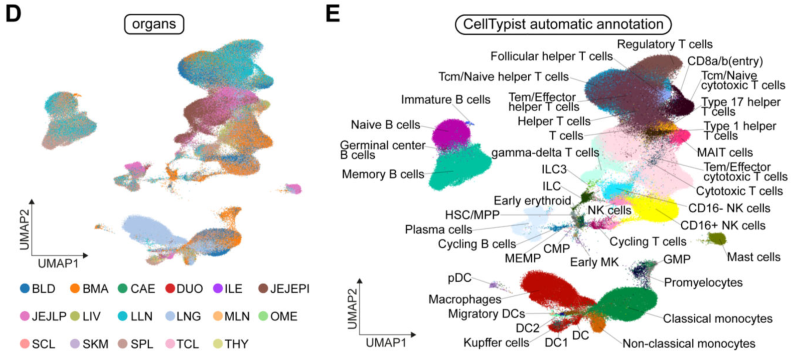 研究內(nèi)容:目前對于人體組織中免疫細胞的分型仍知之甚少,無法快速精準地對免疫細胞進行分型。本研究通過單細胞免疫組庫測序對16份組織類型樣本進行分析,得到了357,211個單細胞數(shù)據(jù),其中329,762個細胞都是免疫細胞,確定了43個細胞特異性的細胞亞群,構建了人類跨組織的免疫細胞圖譜,揭示了已知免疫細胞類型在不同組織微環(huán)境中的分布情況,并解析了人類免疫系統(tǒng)的組織特異性以及豐富的T細胞和B細胞克隆型,同時開發(fā)了CellTypist細胞類型自動注釋平臺。