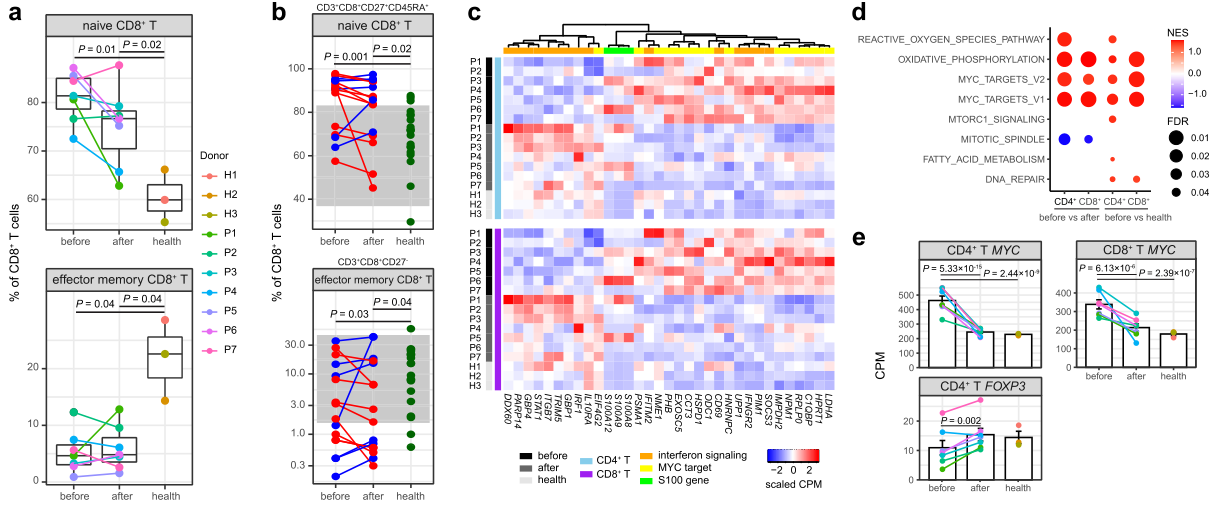 樣本設計:7名急性KD患者接受靜脈注射免疫球蛋白(IVIG)治療前、后,3例年齡匹配的健康對照,取新鮮外周血PBMC樣本,進行scRNA+scTCR+scBCR測序。