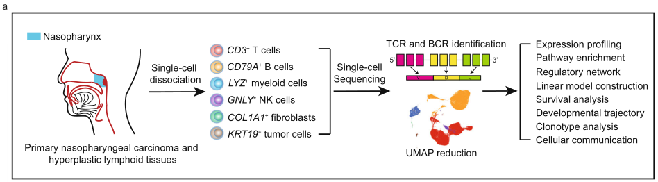 樣本設計:11例鼻咽癌患者的腫瘤樣本和3例非惡性鼻咽淋巴增生的樣本,進行scRNA+scTCR+scBCR測序。