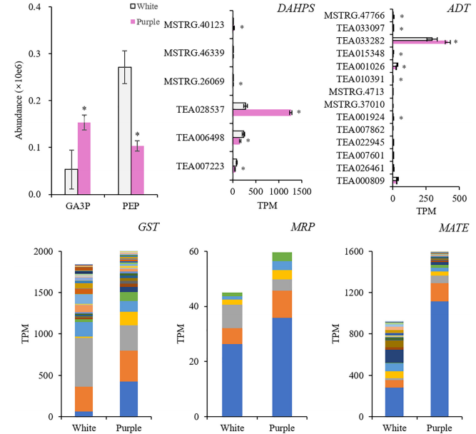 選擇與AP和DpG高度相關(guān)的轉(zhuǎn)錄因子(TFs),研究它們與差異表達(dá)的結(jié)構(gòu)基因的相關(guān)性。結(jié)果顯示MYB、AP2/ERF、bZIP、TCP、GATA等基因顯著表達(dá),并專注于Phe上游合成基因的調(diào)控(DAHPS;和AP(苯乙醛還原酶、短鏈脫氫酶/還原酶)、Dp(F3’H;F3’?5’?H)和DpG(BZ1)的合成,但抑制黃酮(黃酮醇合酶)和兒茶素(白花青素還原酶)的形成。這些結(jié)果發(fā)現(xiàn)了紫茶樹中揮發(fā)性BPs的促進(jìn)作用,擴(kuò)展了我們對(duì)BPs型顏色與香氣關(guān)系的理解。