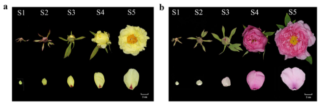 為表征樹牡丹花色發(fā)育情況,以黃花品種“海黃”和紫紅花品種“肉芙蓉”為研究對(duì)象,在花蕾早期至盛開的S1-S5共5個(gè)發(fā)育階段對(duì)兩個(gè)品種的花瓣組織進(jìn)行了取樣,用于測(cè)定花瓣顏色指數(shù),在“海黃”中發(fā)現(xiàn)L *(明度)值從S1到S5逐漸增加,這表示花瓣顏色明度升高。C *(色度)和b *(黃色)在S3達(dá)到峰值,隨后在S4和S5下降,證明S3是顏色最黃的階段。而“肉芙蓉”在整個(gè)開花過程中沒有觀察到L *的顯著變化。在S1到S5階段,“肉芙蓉”中b *顯著低于“海黃”。同樣,“肉芙蓉”中a *(紅色)比“海黃”要高得多。