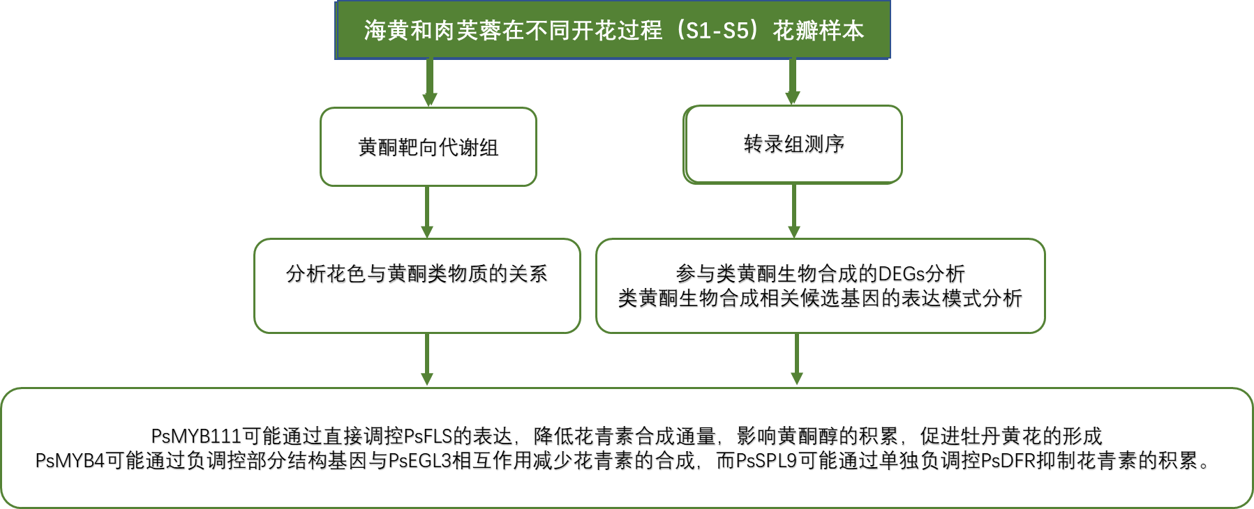 全長(zhǎng)轉(zhuǎn)錄組分析結(jié)果顯示,“海黃”黃酮類生物合成基因在S2階段比“肉芙蓉”表達(dá)水平高,分別為PsCHSs和PsCHIs,PsCHS在合成THCs中有重要作用,而PsCHI在黃酮合成過程中發(fā)揮關(guān)鍵作用,這有助于黃色著色,此外,注釋為PsF3Hs的基因也有很高的轉(zhuǎn)錄水平。在這些基因中,PsFLS可以改變黃酮類途徑,以促進(jìn)黃酮醇的合成。“海黃”和“肉芙蓉”中這些表達(dá)的變化與“海黃”中高水平的THC、黃酮和黃酮醇一致。S2 vs?S3階段,發(fā)現(xiàn)“海黃”中PsDFRs和PsUFGTs表達(dá)水平顯著下調(diào),PsDFR和PsUFGT在花青素合成中起關(guān)鍵作用,如Cy3G,Pn3G和Pg3G的生物合成。因此,PsDFRs和PsUFGTs在“海黃”表達(dá)下調(diào)可以解釋這種黃色花卉品種中缺乏花青素的產(chǎn)生。