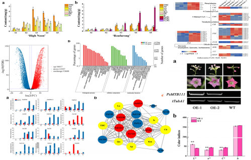 多組學(xué)研究在植物領(lǐng)域中的應(yīng)用案例3、代謝組+轉(zhuǎn)錄組聯(lián)合分析揭示了紫茶花中苯類-苯丙烷色素和香氣的關(guān)系
