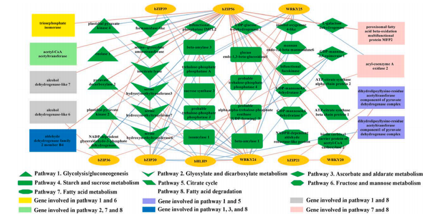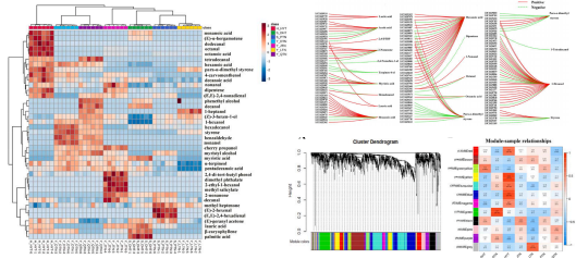 該研究對(duì)中國(guó)7個(gè)地區(qū)突尼斯石榴的代謝組和轉(zhuǎn)錄組、風(fēng)味相關(guān)屬性和揮發(fā)性化合物進(jìn)行了研究。7個(gè)不同種植區(qū)的石榴,糖、有機(jī)酸和維生素c含量存在顯著差異。所有樣品共鑒定了40種揮發(fā)性化合物,其中13種揮發(fā)性化合物。所有樣品中有4種化合物含量較高,包括1-己醇、(Z)-3-己烯醇、α-松果醇和2,4-二叔丁基苯酚,是影響石榴香氣品質(zhì)的主要貢獻(xiàn)因素。所有樣品的5個(gè)差異積累代謝物,包括棕櫚酸、辛酸、月桂酸、癸酸和肉豆蔻酸,在所有樣品的脂肪酸生物合成中均顯著富集。WGCNA分析結(jié)果表明42個(gè)候選風(fēng)味相關(guān)差異表達(dá)基因和9個(gè)轉(zhuǎn)錄因子主要位于3個(gè)關(guān)鍵模塊中。己烷酸是一種重要的代謝物,與38個(gè)差異表達(dá)基因顯著相關(guān)。本研究構(gòu)建了復(fù)雜的調(diào)控網(wǎng)絡(luò),以確定調(diào)控石榴中揮發(fā)性化合物代謝的結(jié)構(gòu)基因和轉(zhuǎn)錄因子,發(fā)現(xiàn)bZIP56、bZIP56、bZIP20、WRKY24和bHLH9在石榴果皮的風(fēng)味代謝調(diào)控中起重要作用。