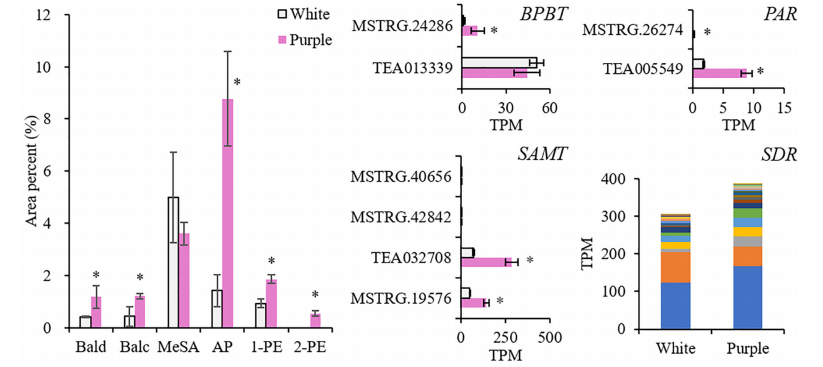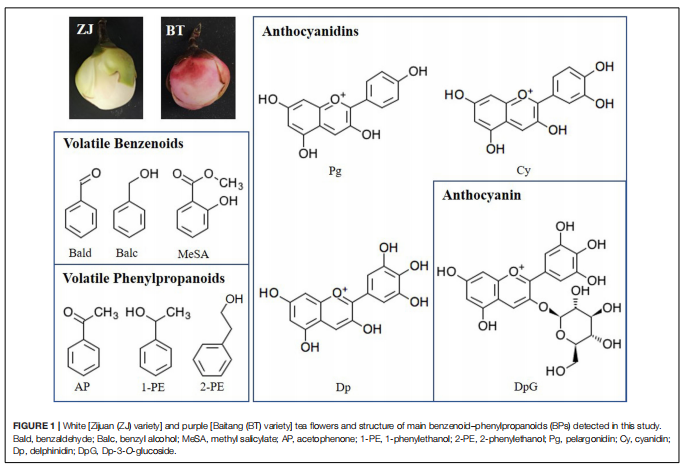 山茶花的花通常是白色的,葉片是紫色的,研究發(fā)現(xiàn)了一種特殊的品種,葉子和花都是紫色的,而研究者通常關(guān)注顏色形成的機(jī)制,而忽略了香氣的變化。紫茶樹含有更多的花青素,屬于黃酮類化合物。同時(shí),由莽草酸途徑衍生的苯丙氨酸(Phe)是黃酮類化合物和揮發(fā)性苯類苯丙素(BPs)的前體。因此,目前尚不清楚BP的香氣是否因紫色的出現(xiàn)而減弱。