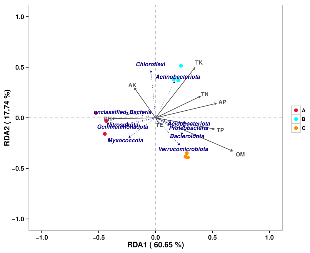 RDA/CCA分析:RDA(Redundancy analysis)/CCA(Canonical Correspondence analysis)是基于對(duì)應(yīng)分析發(fā)展的一種排序方法,RDA分析基于線性模型,CCA分析基于單峰模型,主要用來反映菌群或樣品與環(huán)境因子之間的關(guān)系。根據(jù)物種分布變化,選擇最*的分析模型。