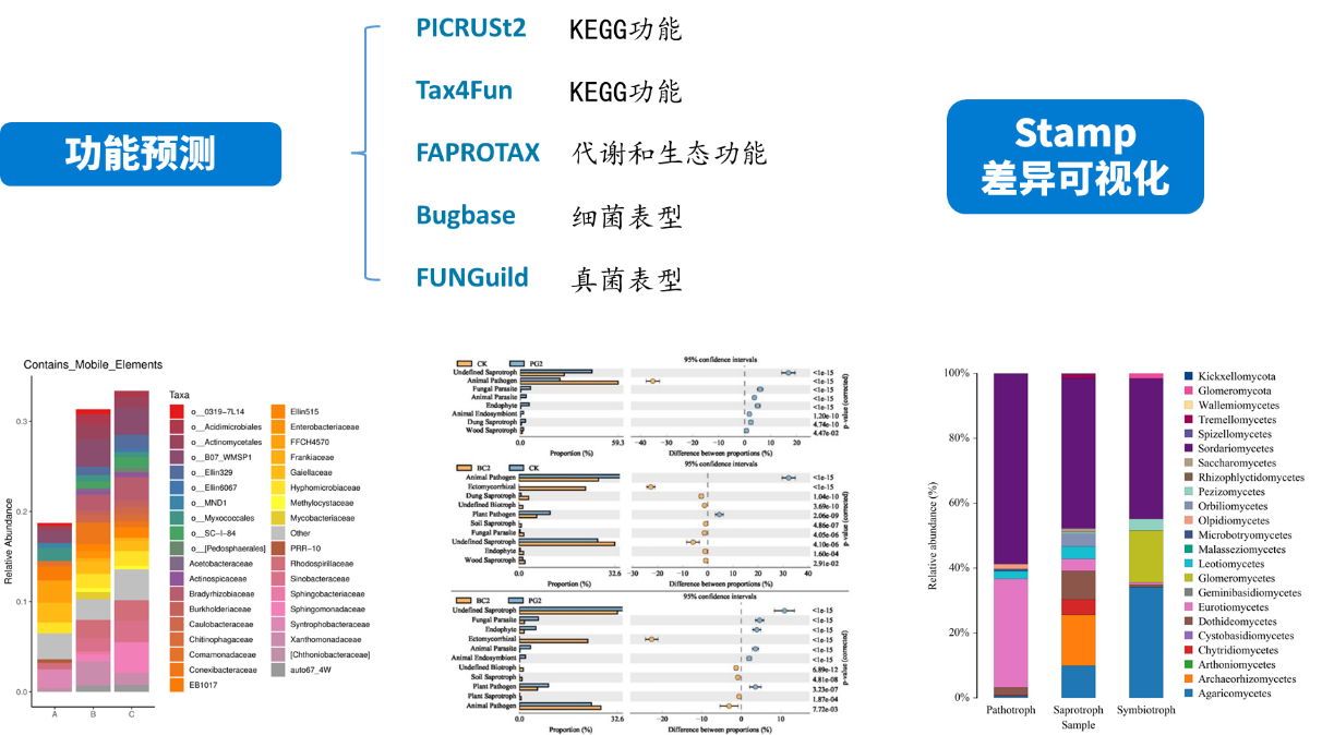 PICRUSt 2 將特征序列(16S rRNA)與微生物基因組數(shù)據(jù)庫(IMG,Integrated Microbial Genomes)參考序列對(duì)齊(aliign)構(gòu)建進(jìn)化樹,找到特征序列的“最近物種”,并根據(jù)已知物種的基因種類和豐度信息預(yù)測未知物種的基因信息,從而結(jié)合基因的KEGG通路信息預(yù)測整個(gè)群落的通路情況。通過組間差異分析,得到在組間具有顯著差異的功能,最后利用Stamp對(duì)結(jié)果進(jìn)行差異可視化。