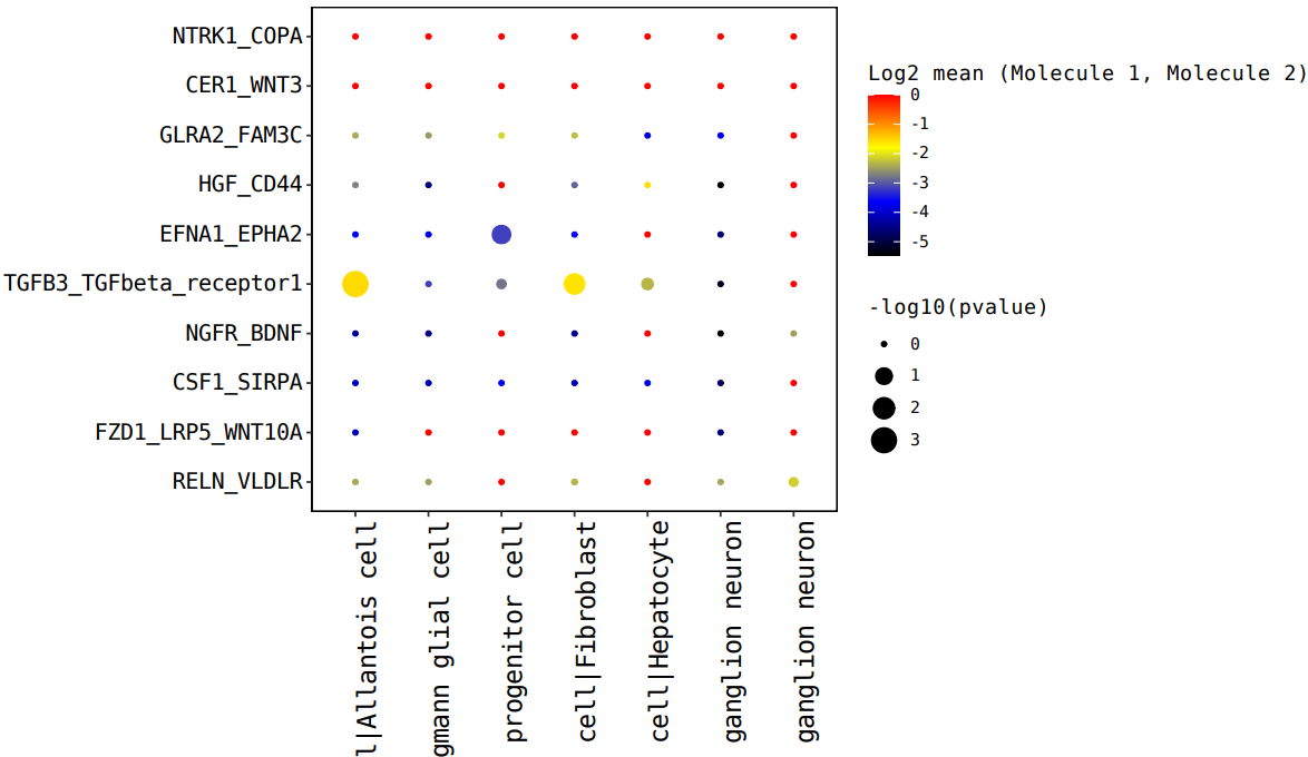 注:橫坐標(biāo)是細(xì)胞類(lèi)型互作,縱坐標(biāo)是蛋白互作,點(diǎn)越大表示 p 值越小,顏色代表平均表達(dá)量