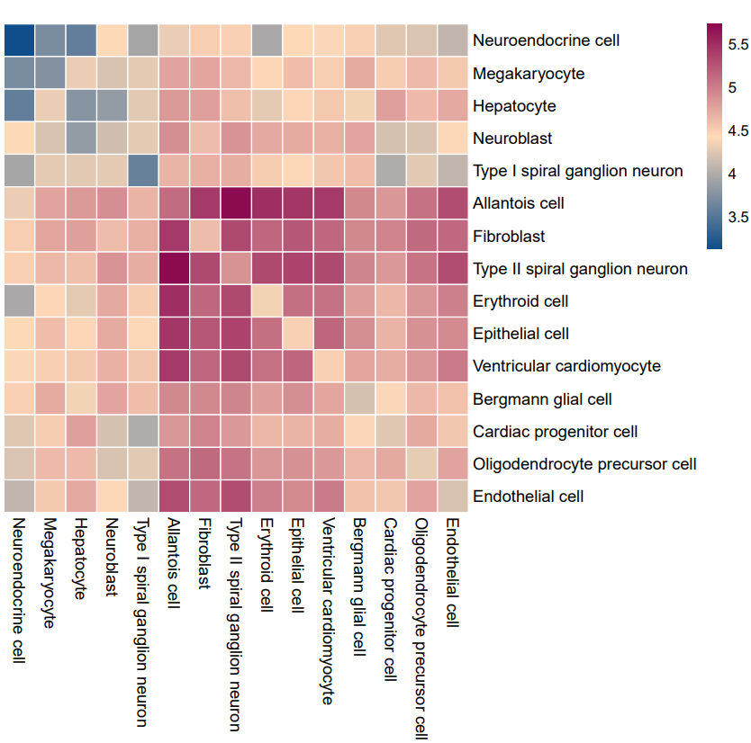 注:橫縱坐標(biāo)表示細(xì)胞類(lèi)型,顏色深藍(lán)色到紫紅色代表互作數(shù)由低到高