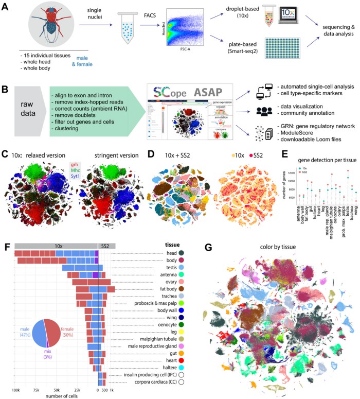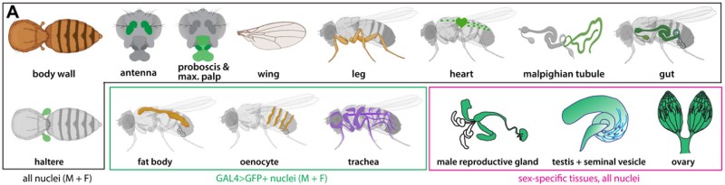 實(shí)驗(yàn)方法:解剖了來自雌性和雄性黑腹果蠅的12個(gè)組織(觸角、體壁、脂肪體、平衡棒、心臟、腸道、腿、馬氏管、絳色細(xì)胞、喙和下顎須、氣管、翅膀)以及3個(gè)性別特異性組織(雄性生殖腺、睪丸、卵巢)。對于遍布全身的組織使用特異性GAL4驅(qū)動(dòng)核-GFP蛋白,再用流式細(xì)胞熒光分選技術(shù)標(biāo)記和收集細(xì)胞核,進(jìn)行單細(xì)胞核snRNA-seq