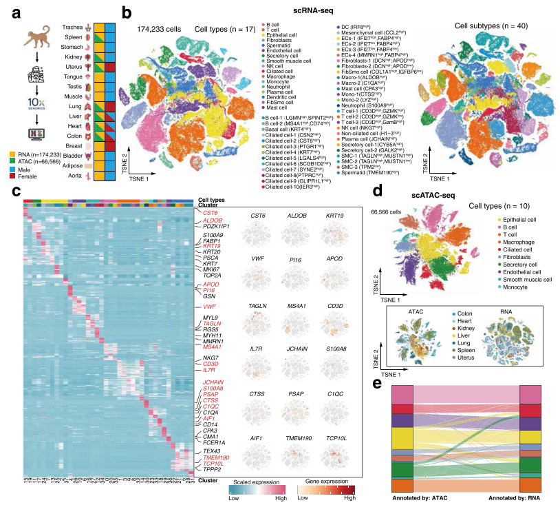 該研究對成年食蟹猴的16個(gè)代表性器官進(jìn)行單細(xì)胞轉(zhuǎn)錄組測序和單細(xì)胞染色質(zhì)開放性測序,構(gòu)建了食蟹猴多器官的單細(xì)胞多組學(xué)參考圖譜,將25萬個(gè)細(xì)胞進(jìn)行 t-SNE降維聚類得到40余種不同的細(xì)胞亞群。