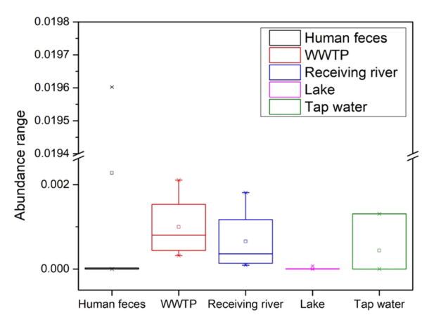 此外,人類糞便樣本中ARGs豐度與 crAssphage豐度之間沒有相關(guān)性,證實(shí)了腸道里 ARGs 豐度與crAssphage 豐度無關(guān)。這對(duì) crAssphage作為人類糞便污染的指示基因至關(guān)重要。因此,上述環(huán)境樣本中ARGs 與 crAssphage 豐度之間的顯著正相關(guān)表明供試受納水體中 ARGs 的富集在很大程度上可歸因于人類糞便污染。