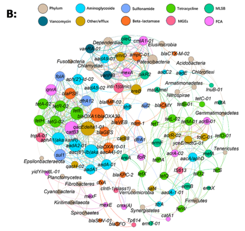 在該研究中,84個(gè)ARGs、5個(gè)MGES和20個(gè)細(xì)菌門被用來進(jìn)行網(wǎng)絡(luò)分析(圖6B)。Chlamydiae和Dependentiae 與11種不同的ARG顯著相關(guān),表明它們的基因組中可能含有多種ARG類型。四環(huán)素耐藥基因、大環(huán)內(nèi)酯類耐藥基因ermB和氨基糖苷類耐藥基因aacA/aphD是四環(huán)素耐藥基因的潛在宿主。Elusimmicrobia可能是aadE、blaCTX-M-02、Olec和vanRA-01的宿主。Synergistetes 可能是tetW、IS613和catA1的潛在宿主。由于該網(wǎng)絡(luò)是建立在相關(guān)性的基礎(chǔ)上,觀察到的ARGs潛在細(xì)菌宿主仍需進(jìn)一步的試驗(yàn)驗(yàn)證。