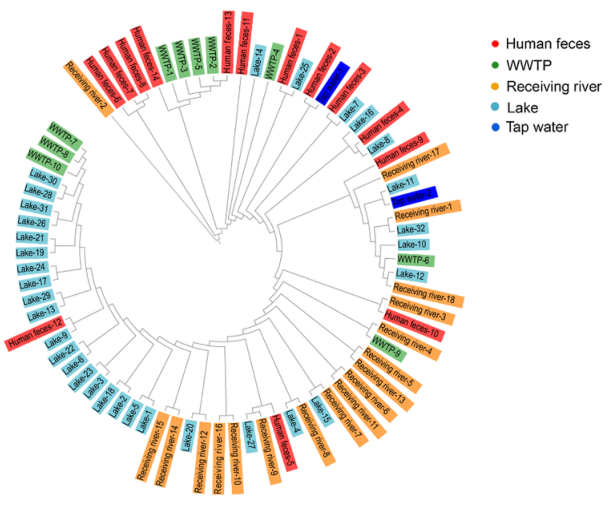除了crAssphage 之外,研究者通過構(gòu)建系統(tǒng)發(fā)育樹分析了來自所有樣品的氨芐青霉素抗性菌株中的 blaTEM-1基因序列(圖4)。結(jié)果表明,來自四種環(huán)境樣品(湖水、自來水、污水處理廠和受納河水)的blaTEM-1與腸道樣品的進(jìn)化關(guān)系密切(圖4)。該結(jié)果表明blaTEM-1可能通過污水排放在人類糞便和受納水體之間進(jìn)行傳播。然而,需要進(jìn)一步的研究來驗(yàn)證這些發(fā)現(xiàn)。